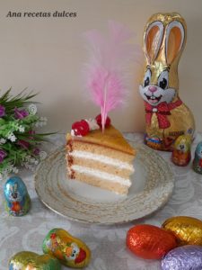 Hoy os propongo esta mona de pascua de nata con yema tostada, lleva un esponjoso bizcocho de vainilla, relleno con nata montada y cubierto con una capa de yema tostada y almendra crocanti.