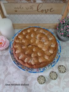 Vertemos la mezcla en el molde, esparcimos azúcar por toda la superficie y la decoramos con las almendras crudas.